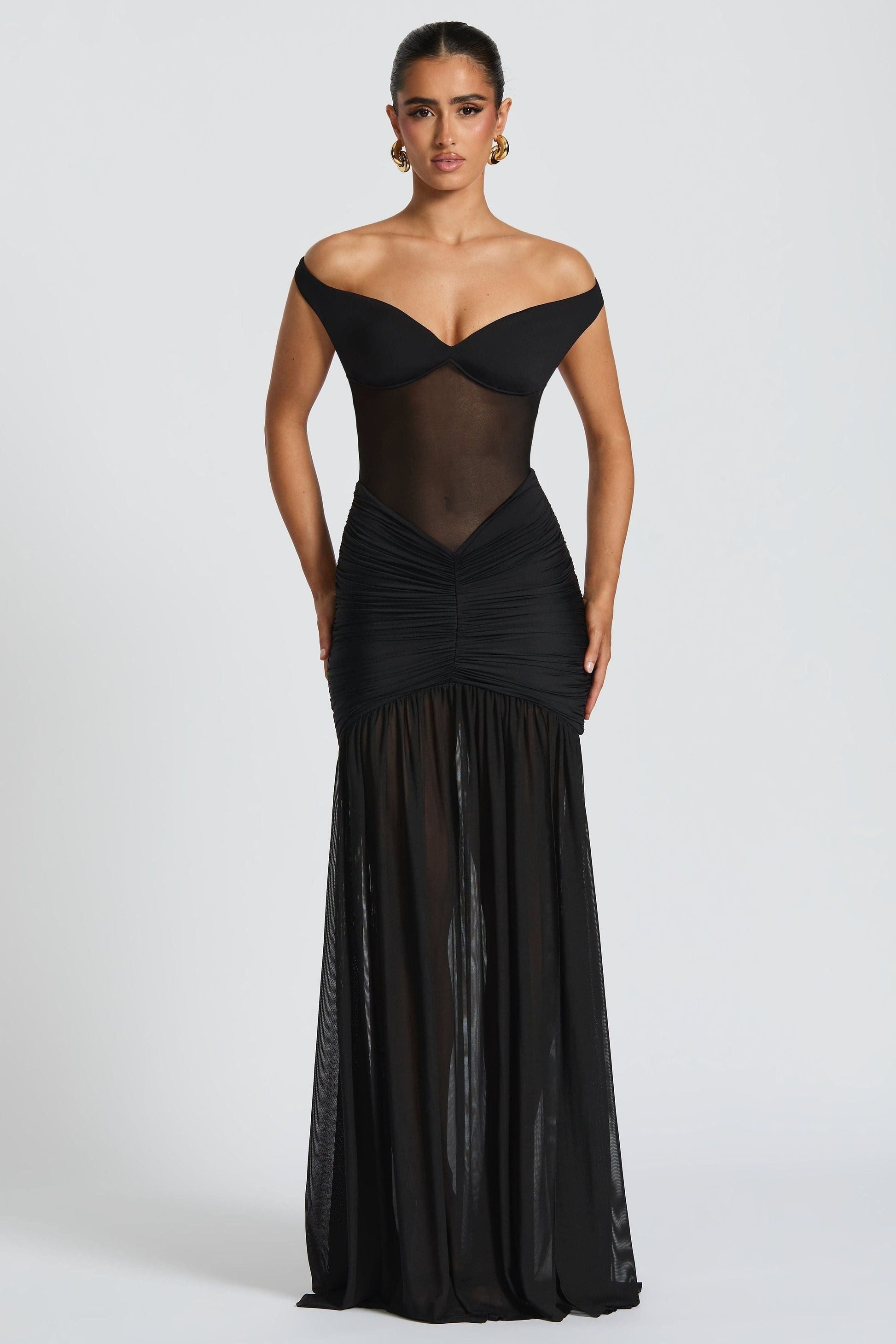 Crafted from shimmering metallic fabric in a vibrant lime green hue, Alya features an off-shoulder design with elegant draping that frames the décolletage beautifully. The figure-hugging silhouette flows into a dramatic floor-length skirt with a sultry front slit that adds movement and allure.