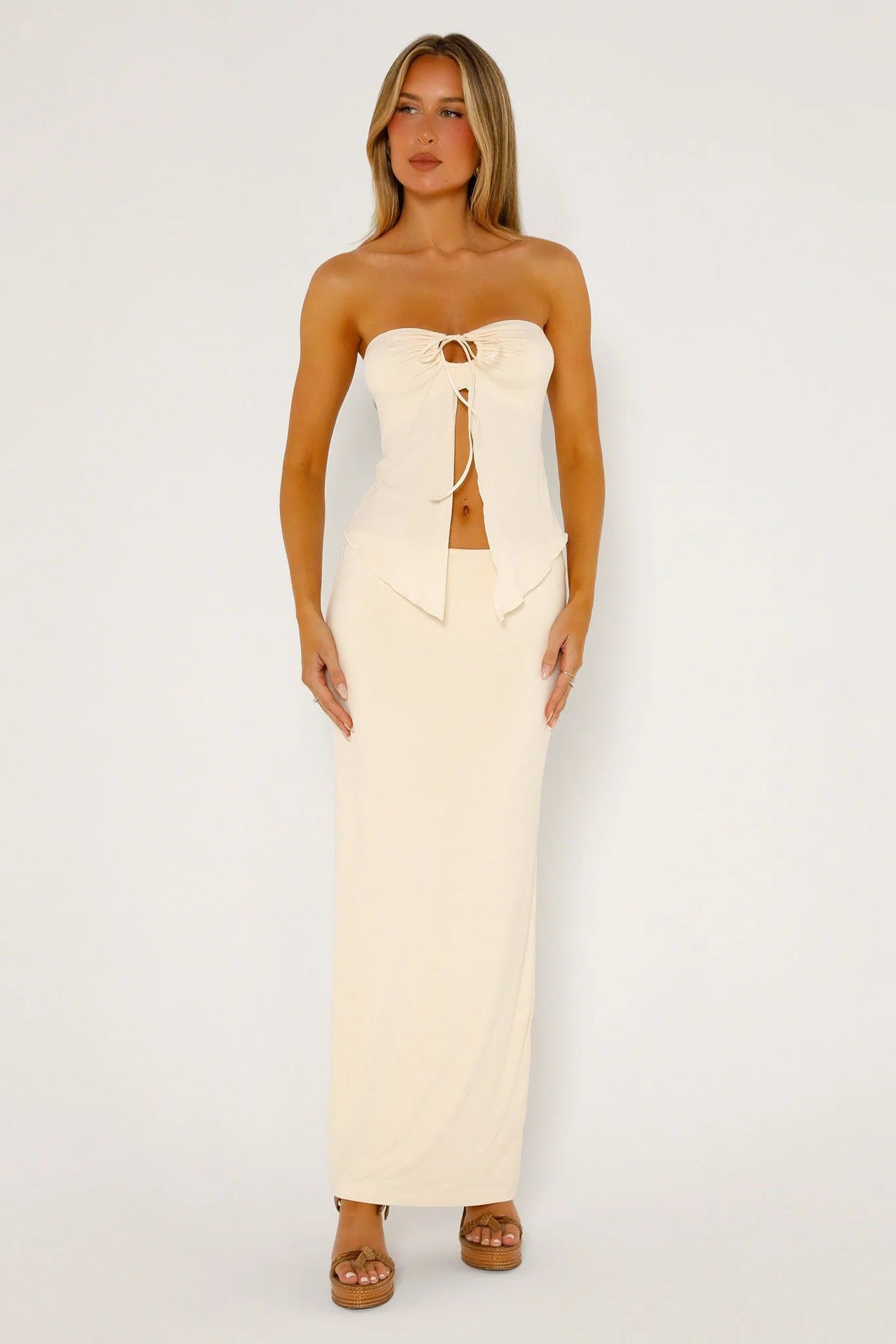The Calyope Mesh Dream Set is an ethereal two-piece that features a strapless bandeau top with a flirty tie-front cutout and a flowing pointed hem, paired with a sleek, body-hugging maxi skirt that sits low on the waist. The airy mesh fabric and minimalist silhouette create a look that’s both dreamy and alluring.