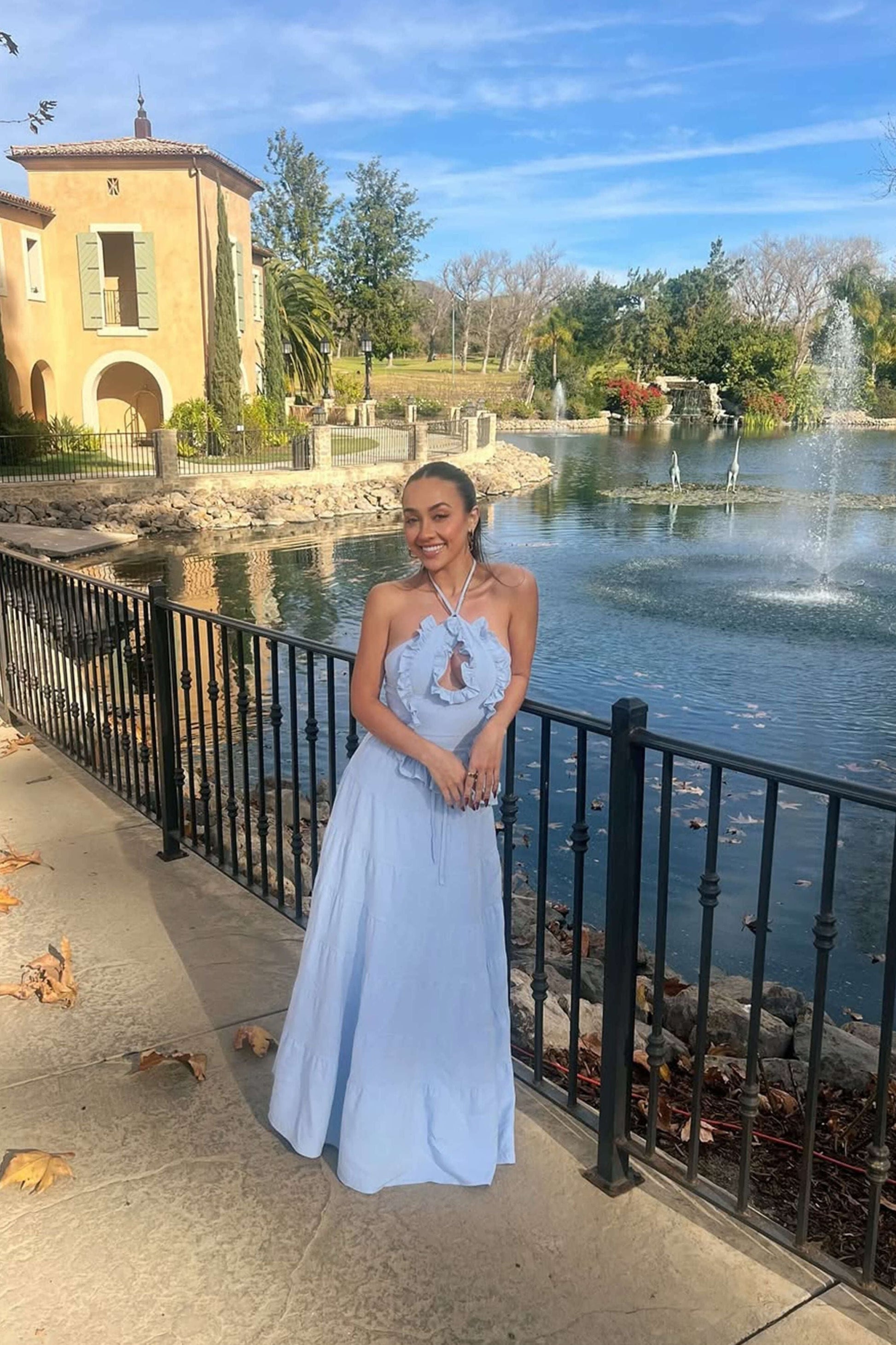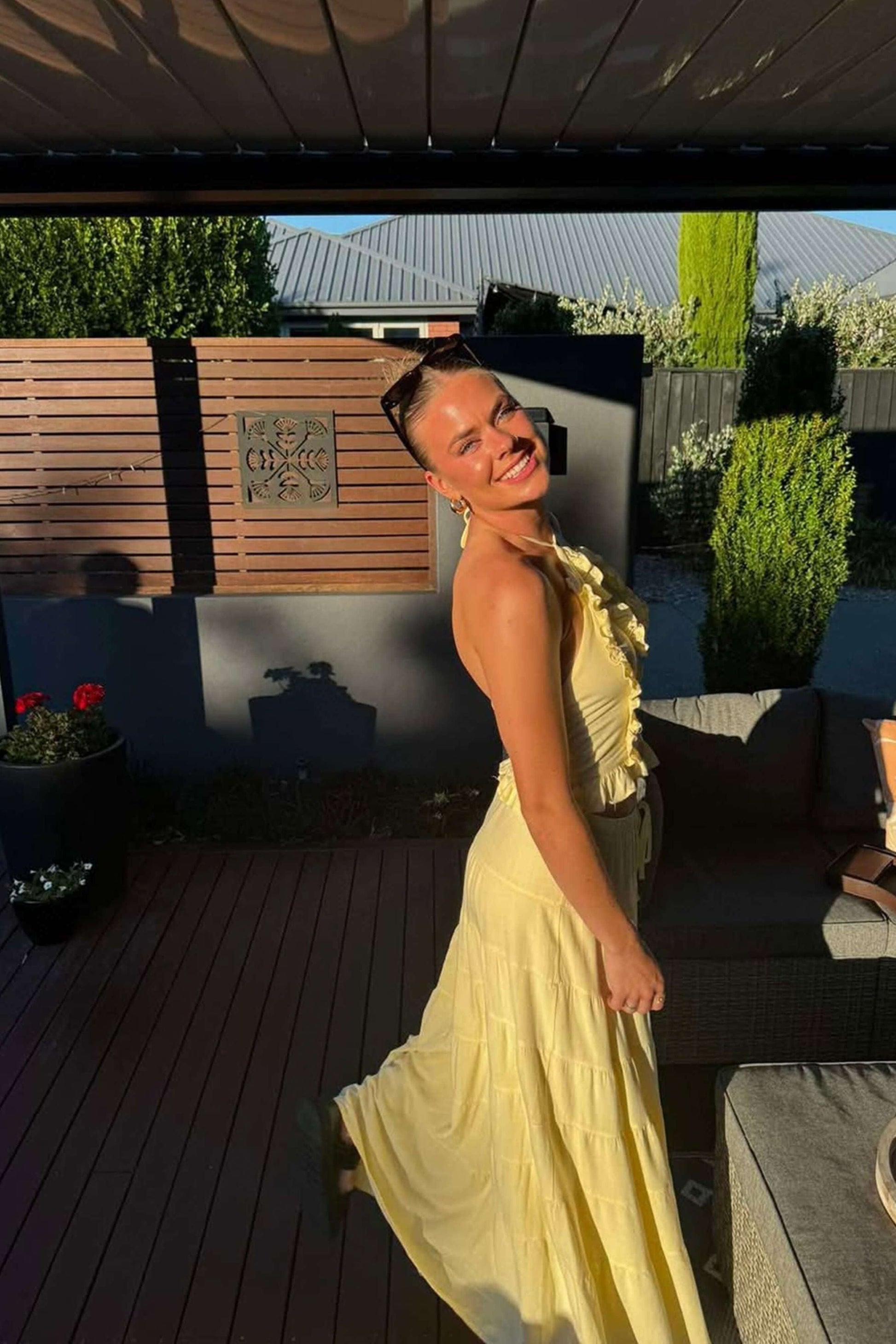 Halter neckline with ruffle detailing for a stylish touch